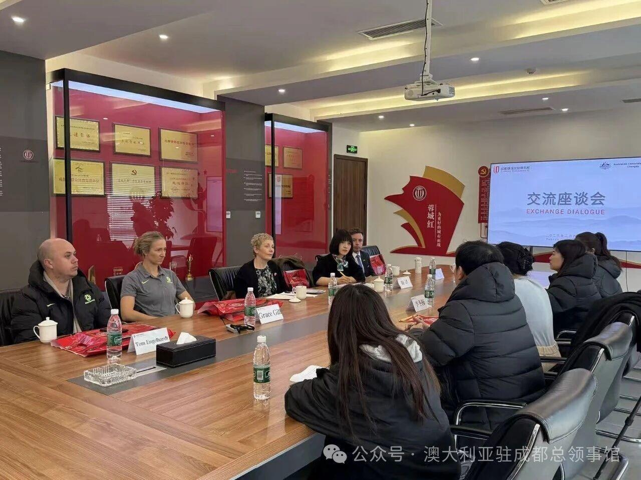 据澳大利亚驻成都总领事馆消息,在今年2月,澳大利亚驻成都总领事邵美珍、领事米克、格蕾丝和汤姆一行到访成都蓉城足球俱乐部。